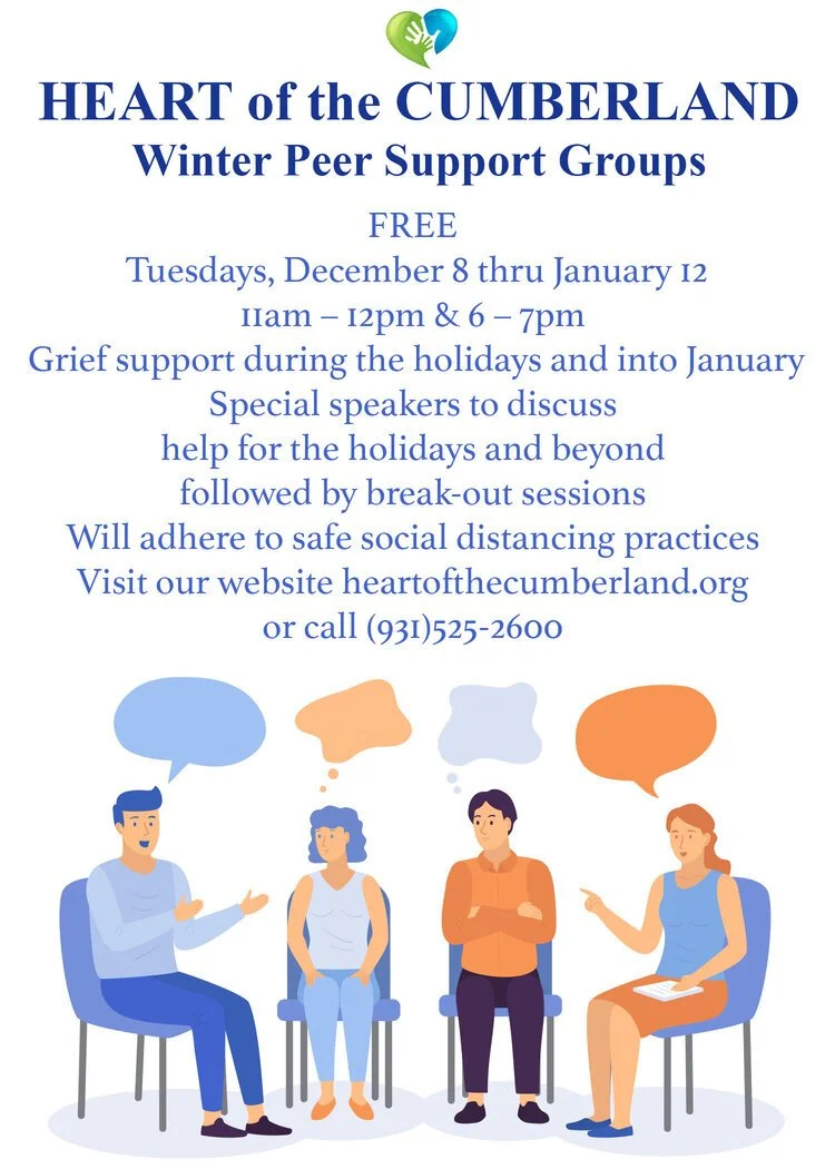 2020-2021 Join a Winter Support Group Tuesday, December 8, 2020 11:00 AM Tuesday, January 12, 2021 7:00 PM Google Calendar ICS Holidays and winter can be difficult months while grieving the loss of a loved one. We are here for you. You can attend one or all of the groups where guest speakers will share, followed by smaller facilitated break out peer support groups. Click here to join a group