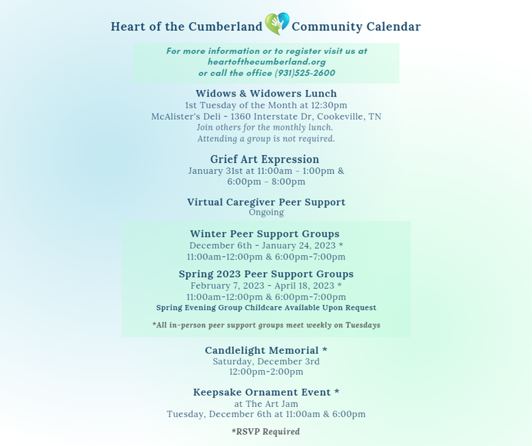 Winter 2022 - Spring 2023 Groups & Events Tuesday, December 6, 2022 11:00 AM Tuesday, April 18, 2023 7:00 PM Google Calendar ICS